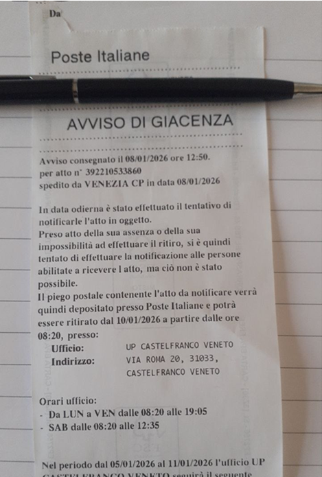 In data 08.01.2026, un addetto di Poste Italiane ha tentato la consegna di un presunto atto giudiziario presso il sottoscritto.